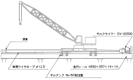 今回の現場で実施された新工法(全天候型建築工法)では、横行装置にチルクライマーとチルタンクが採用されました。