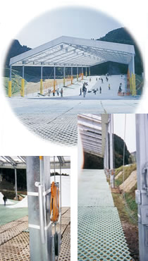 人工スキー場、ゲレンデテント屋根(幅30m、長さ90m)の開閉装置に、手動チルホールTU-16型(能力1600kg)、18台が採用されました。