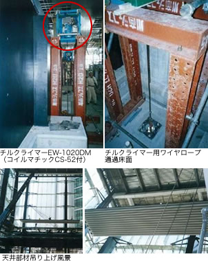 この工法は、天井部にワイヤロープの通る穴を設け、天井上部にチルクライマーEW-1020DM 6台を設置し、自重2t(寸法:16.5m×6.4m)の天井部材を歪める事なく安全に一気に吊り上げる事ができました。