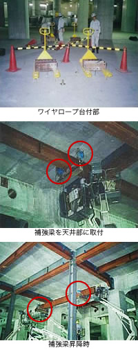 この工法は、天井床面にワイヤロープを通す穴を設け、鉄骨梁に取付られたチルクライマーにワイヤロープをセットするだけで、一気に鉄骨梁を補強部分まで吊り上げる事ができます。