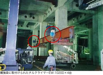 各階の床面工事が既に完了している事から、クレーンを使用する事ができず、チルクライマーEW-1020D(能力:1000kg)を4台使用した新工法が採用されました。