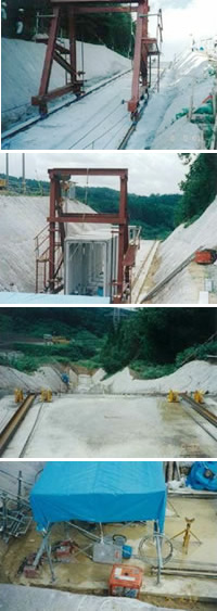 この工法は、上部でボックスカルバートを架台に吊り上げ、この架台を上部に設置されたチルクライマーEW-2030D(能力:2000kg)2台で随時下方に移動し、据付工事を行うもので、架台はチルクライマーの往復牽引機構により平坦、傾斜の繰り返し路面でも移動が可能となり、併せて架台を元の位置に戻す事ができます。