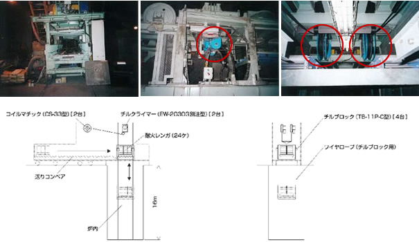 能力2.5tの吊り降ろし用昇降装置にチルクライマーEW-2030G別注型(能力2t)が2台、ワイヤロープの巻き取りにコイルマチックCS-33型(能力30m)が2台使用され、耐火レンガを積んだパレット(約1.2t)を炉内に降ろす作業を安全に行っています。