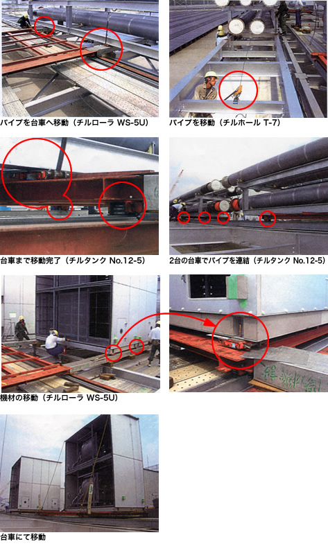 チルローラ(WS-5U)4台を使用し、分割された空調機材をチルタンク(No.12-5:ガイドローラ型)4台を取り付けた搬送台車へ移動させ、2セットの搬送台車にて連結させる。