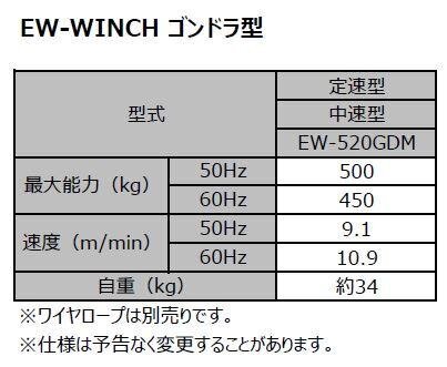 0.5tonタイプの中速ゴンドラ型電動エンドレスウインチ。(50Hz : 9.1 m/min 60Hz : 10.9 m/min)