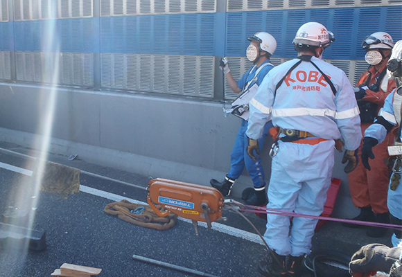 その他、全国の消防署や地域の自治会では、災害対応力向上のため救助資機材としてチルホールが採用されています。動力源の確保が難しい災害時に、小型・軽量でタテ・ヨコ・ナナメ自由自在に牽引できるチルホールは、現場の状況に合わせた細かい作業が可能なため人命救助、安全確保に活躍します。